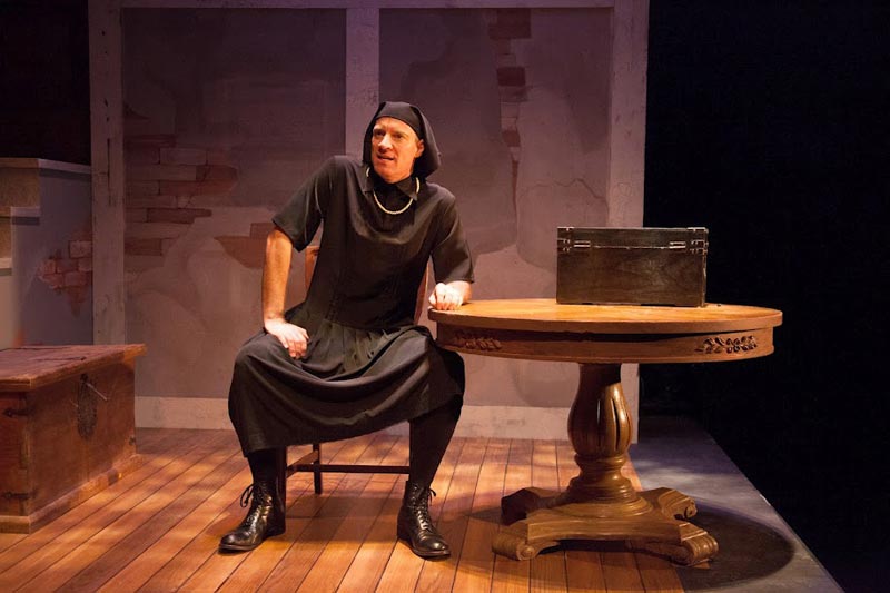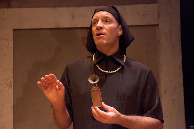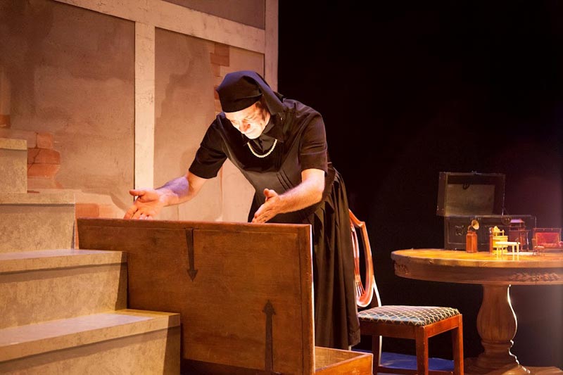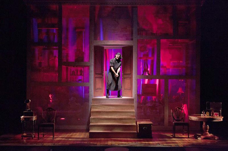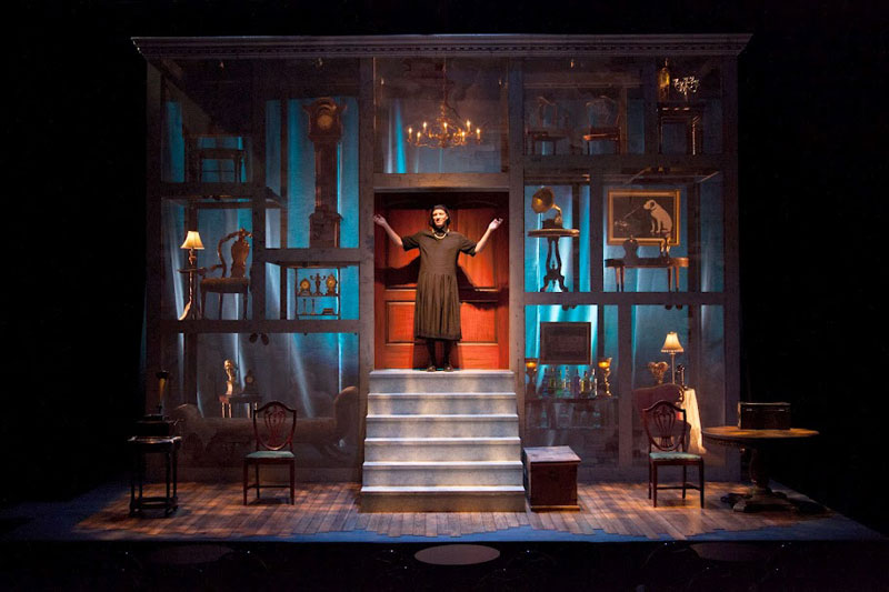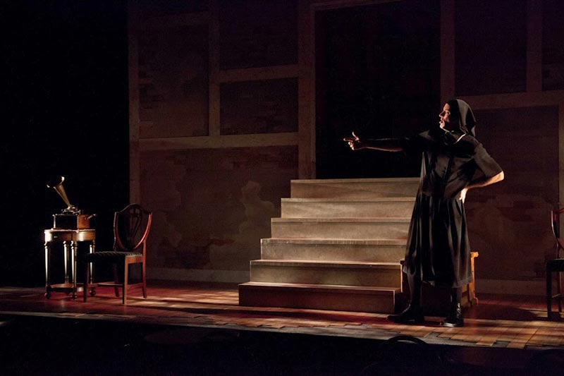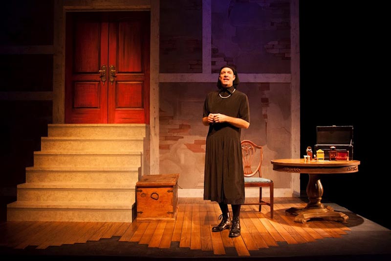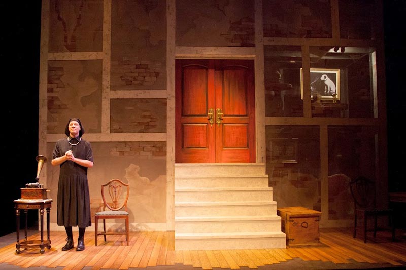ascends the short staircase and exits through the double doors at the end of the one-person play,